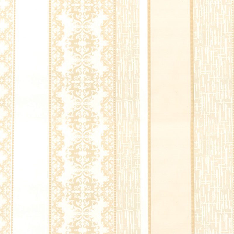 Về bề mặt, đây là một mẫu giấy dán tường sọc dọc phức hợp, thể hiện rõ nét gu thẩm mỹ tân cổ điển. Dải sọc lớn nổi bật với giấy dán tường hoa văn lấy cảm hứng từ nghệ thuật baroque quyền quý. Xen kẽ là các dải sọc trơn và dải sọc có kết cấu giấy dán tường giả vải, tạo nên sự cân bằng độc đáo giữa nét cổ điển sang trọng và cảm giác hiện đại, mộc mạc. Bề mặt giấy mờ mịn, không gây lóa sáng, góp phần tạo nên một không gian tinh tế và đẳng cấp.