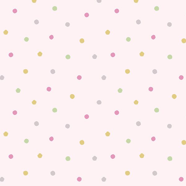 Tông màu chủ đạo: Nền chính của sản phẩm là một màu hồng phấn (pastel pink) cực kỳ nhạt, có thể chuyển sang tông giấy dán tường màu be ấm áp dưới một số điều kiện ánh sáng. Sắc giấy dán tường màu hồng dịu ngọt này giúp phản xạ ánh sáng tốt, làm căn phòng trông rộng rãi hơn. Trên nền đó là các họa tiết chấm bi đa sắc với các tông màu pastel bổ trợ như hồng đậm, xanh bạc hà, vàng mustard và xám nhạt, tạo nên một tổng thể hài hòa, vui tươi nhưng không gây rối mắt.