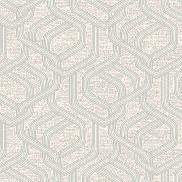 Điểm nhấn ấn tượng của sản phẩm chính là kiểu vân hình học được cách điệu tinh xảo. Các đường kẻ lồng vào nhau một cách nhịp nhàng, tạo thành chuỗi khối đa giác thuôn dài, gợi liên tưởng đến cấu trúc mắt xích sang trọng. Họa tiết này không đơn điệu mà được cấu thành từ nhiều sọc nhỏ, tạo nên hiệu ứng giấy dán tường 3D và chiều sâu thị giác đầy cuốn hút. Bề mặt nền của giấy có kết cấu giấy dán tường giả vải bố (linen) với các thớ dệt ngang dọc tinh tế, mang lại cảm giác ấm áp và gần gũi khi chạm vào. Sự kết hợp giữa họa tiết hình học và nền vải tạo nên một mẫu giấy dán tường hoa văn vừa cổ điển, vừa phá cách.