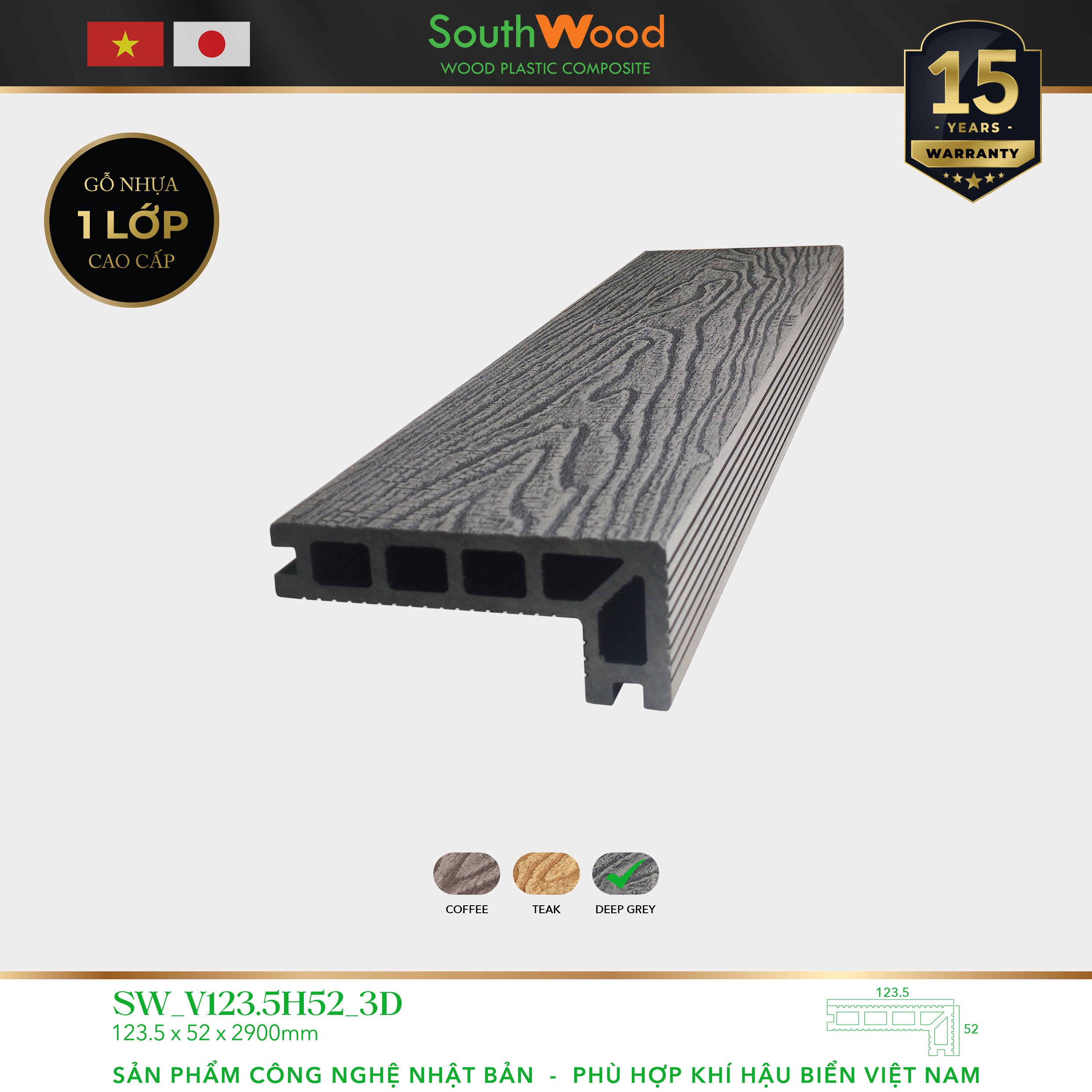 | Tên sản phẩm | Gỗ Nhựa SouthWood V123.5H52 3D Deep Grey |