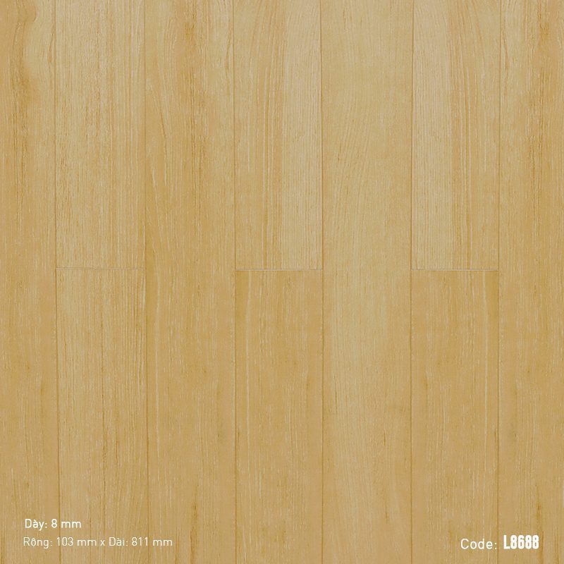 Sản phẩm L8688 sở hữu một vẻ đẹp đầy cuốn hút với tông màu vàng nâu sáng làm chủ đạo. Ánh sắc tựa mật ong nhạt hay màu be ấm áp lan tỏa cảm giác tươi mới, tràn đầy năng lượng và sự ấm cúng. Các đường vân gỗ có màu sáng hơn một chút, chạy dọc song song theo từng thớ gỗ, tạo nên sự chuyển tiếp màu sắc nhẹ nhàng, tinh tế thay vì tương phản gay gắt. Bề mặt được hoàn thiện phẳng mịn, ít phản chiếu ánh sáng, mang lại cảm giác êm ái và dễ chịu khi đi chân trần. Dù không có kết cấu nổi rõ rệt, các chi tiết vân chìm tinh tế vẫn tạo ra một ma sát nhẹ, góp phần tăng cường độ bám và giảm nguy cơ trơn trượt.